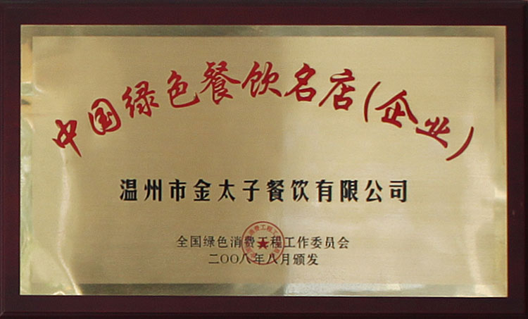 金太子于2008年荣获“中国绿色餐饮名店(企业)”殊荣。纯天然绿色健康的食材,通过优良加工,才会制作出放心的菜品。这是金太子的坚持,也是对广大消费者的承诺。而金太子要传导的就是这样一份绿色的心情,让每一位金太子的顾客,吃得放心,吃得开心,金太子更会将这一抹绿色不断坚持下去,用心做健康的牛排。